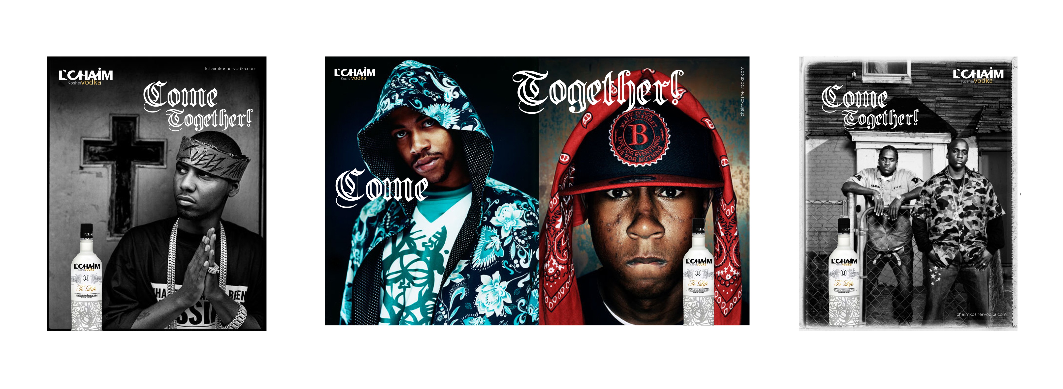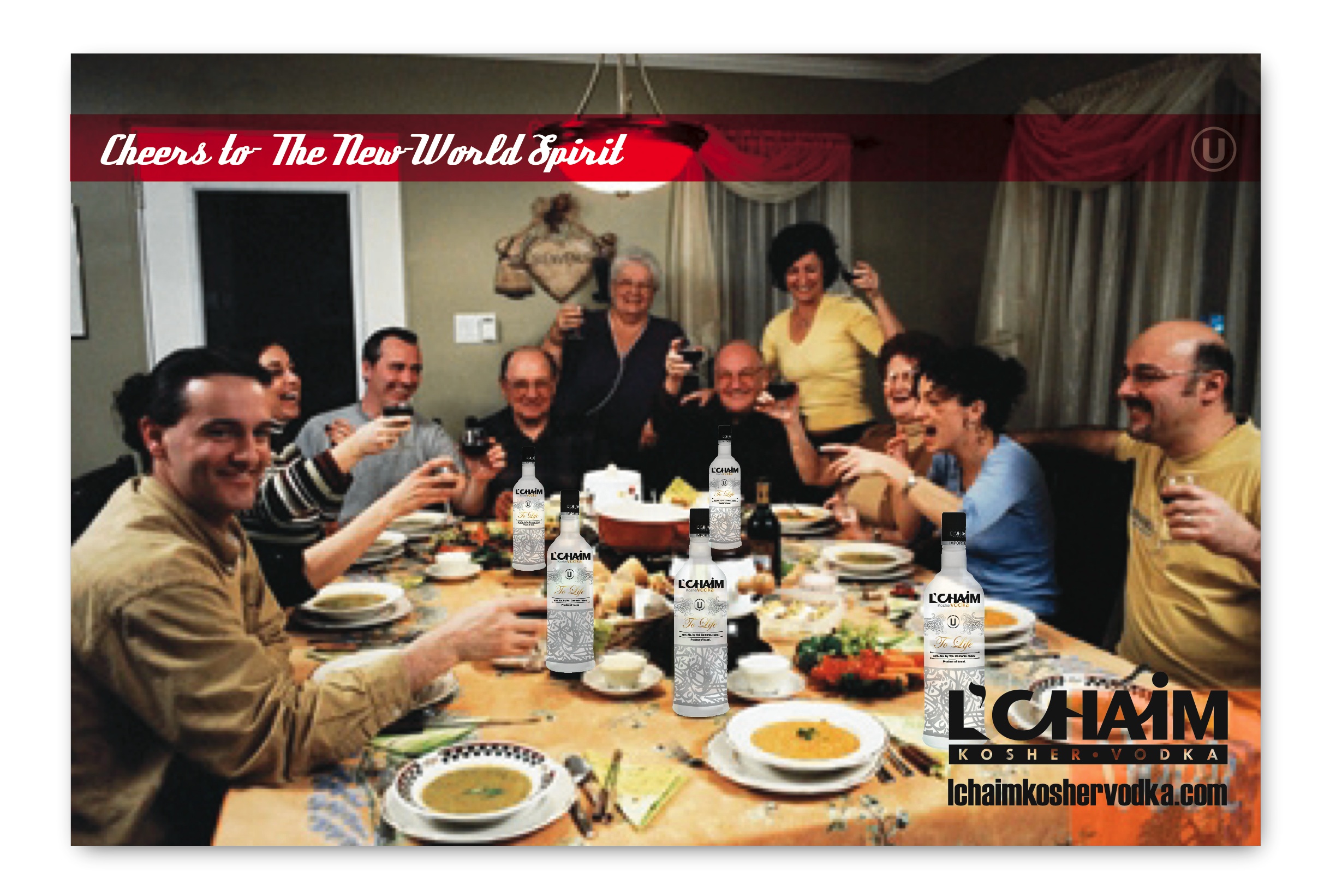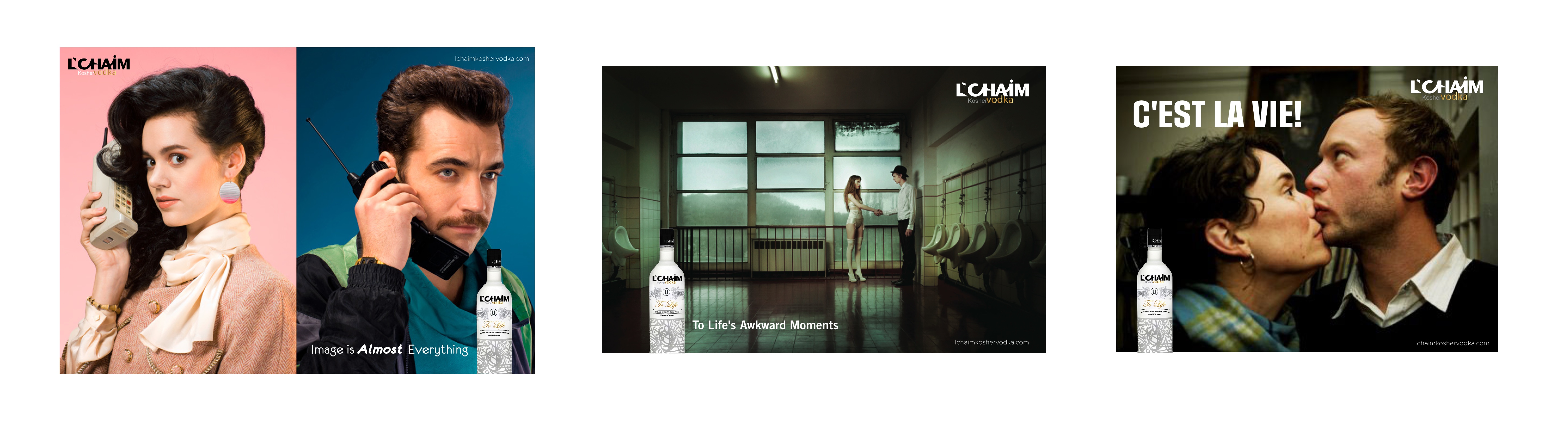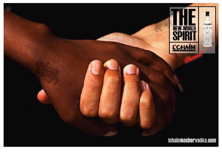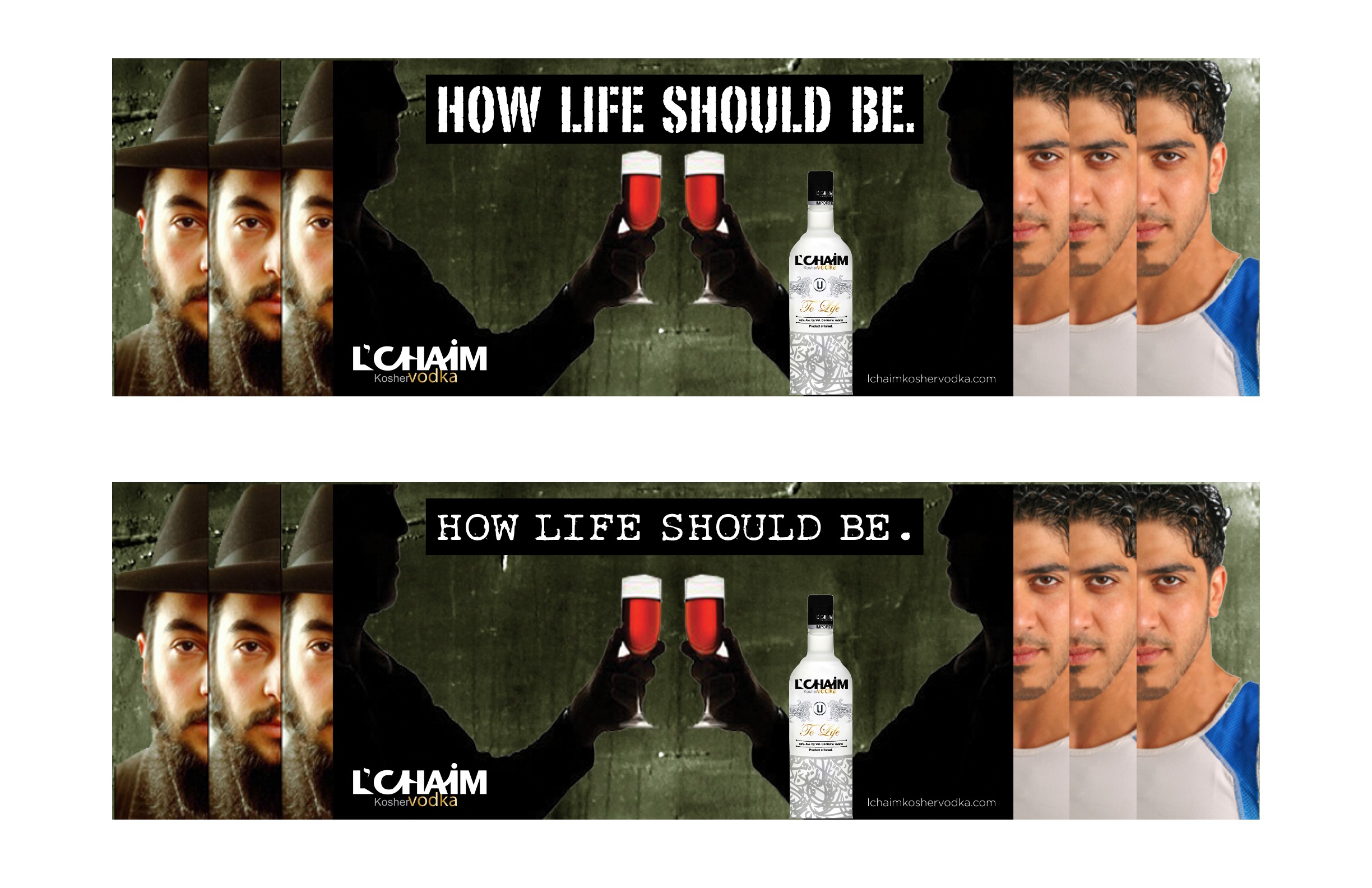 This concept expresses not only the positive/up side of life (“to life”/”cheers”) but also can and will touch on some very serious social issues and tensions. L’Chaim is about bringing the world together in celebration of life. This campaign will bring two “opposites”, “competitors”, “social and political foes’, “public enemy’s” etc. together with memorable graphical images and marketing messages, for example: “How Life Should Be”, L’Chaim, “Come Together”, “To Life”. It also sends a strong message to the world that L’Chaim vodka is a fun brand focusing on the lighter side of life by addressing the heavier side with wit and humor and breaks down the walls of separatism, elitism, stereotypes, hatred and war and evokes images of hope, peace, joy and celebration.