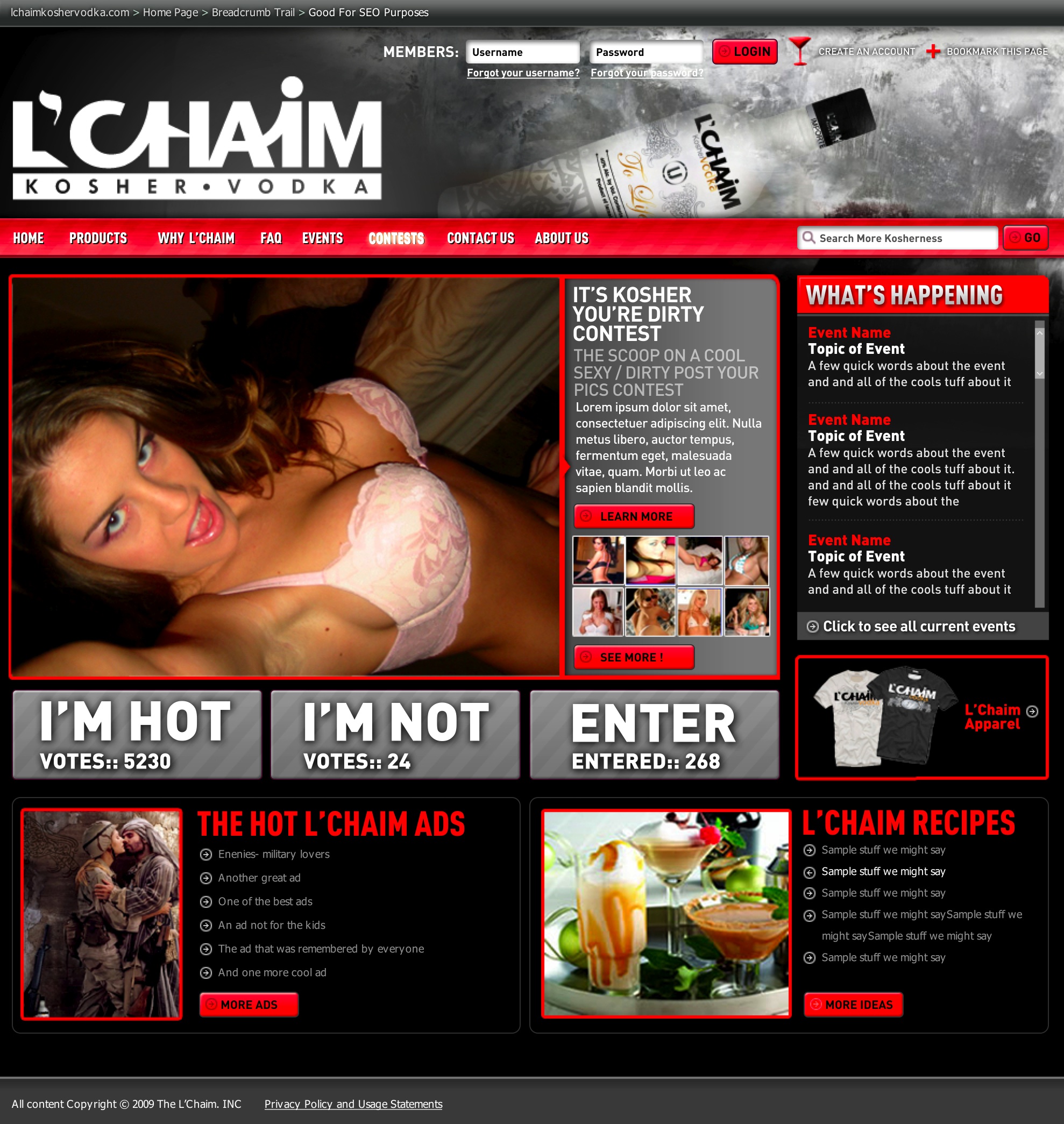 This is a very bold in your face approach to creating/suggesting CHANGE-for the good. It’s revolutionary thinking-provocative, controversial and loaded with shock value. It may even be borderline offensive-but it’s a risk assessment equation. It will cut through cultural, social, political and religious guidelines, standards and traditions and challenge the way people look at and view the world today. It is “A Brave New World” meets the duality of the word “Spirit.” First and foremost, L’Chaim is a “Spirit” meaning an alcoholic beverage or liquor. But secondly and more defining is that L’Chaim is a new way of thinking for the modern man and woman and may even be referred to as a social/political movement or reformation. The buzz and talk value generated by a campaign like this would be intense, fierce and immeasurable . The impact could not be equated to any paid advertising or media opportunity.