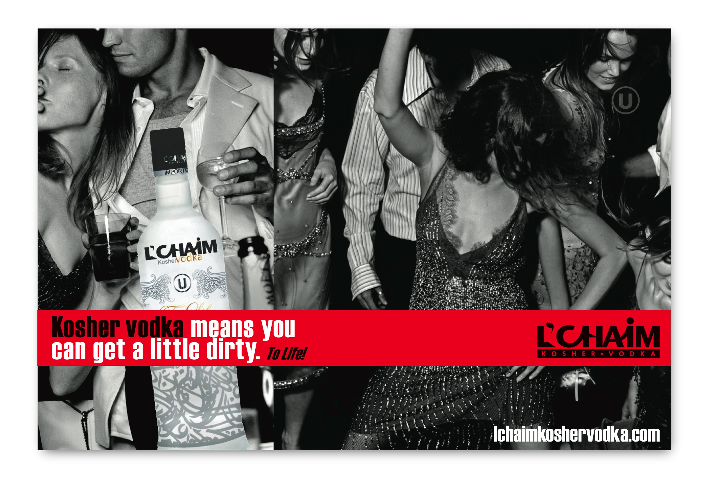 The “U” symbol is also a key element in building this brand and is prominently displayed with purpose. It stands for Orthodox Union Certified. There are about 5 or 6 organizations that certify kosher products around the world. This one is the most recognized and respected. You’ll see it on many product packages. But only Absolut and 3 or 4 other vodkas carry this symbol. Although no one really knows it, almost all vodkas are kosher by design as ingredients make them kosher or non-kosher. Vodkas have no non-kosher ingredients so it is understood by the ‘in the know’ community that even without the symbol most vodkas are kosher. Still we used it as a subtle but important design element/feature and also to proudly (and tactfully) state without fear of alienating any particular market segment that L’Chaim is proud of it’s roots and just better in addition to being different and unique.