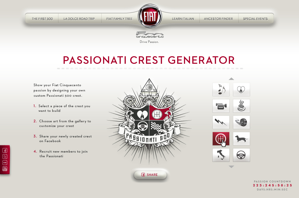 As Digital Agency of Record (DAOR) at SapientNitro, the following pitch and spec work was presented upon the commission of Laura Soave (Brand Lead) and Olivier Francois (CEO + CCO) of Fiat USA in collaboration with Leo Burnett Italy (Fiat-Italy’s AOR) and Impatto (Fiat -USA’s Brand + Design Lead) between June and September of 2010 introducing the Fiat 500 to the North American marketplace-a territory they had been absent from since 1983.