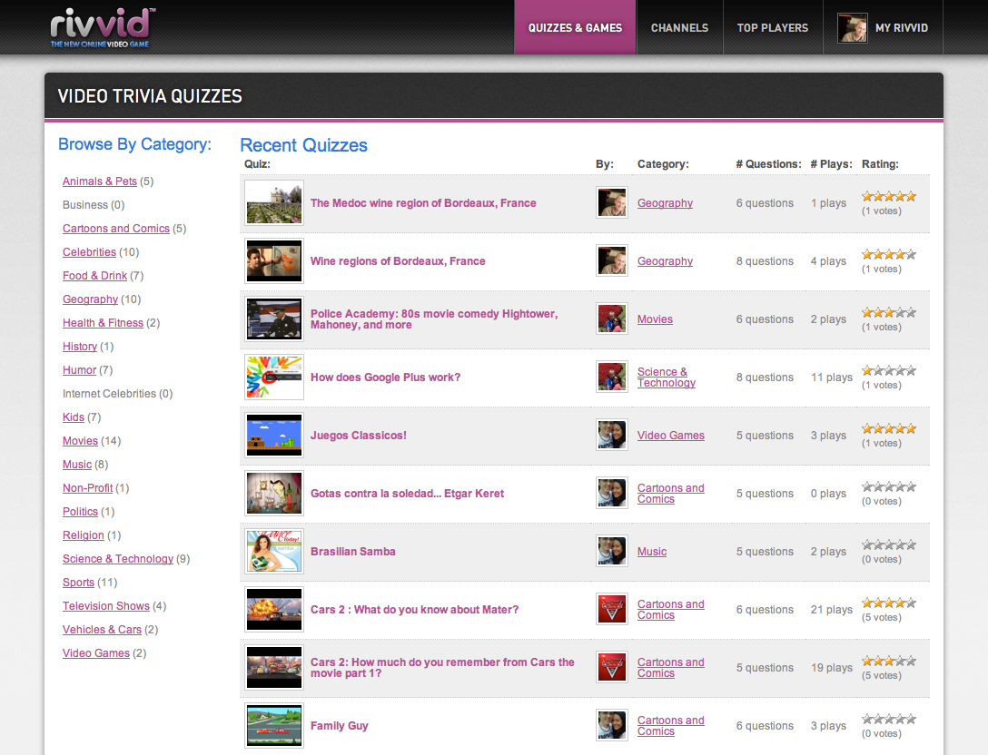tRIVia VIDeo or Real Interactive Viewing of VIDeo (aka RIVVID) breaks the traditional video advertising model by offering guaranteed cognitive awareness of advertising consumption. Users have to pay attention to the videos in order to answer the questions correctly and score points/win prizes, unlike pre-roll ads (which are flat out annoying) and TV ads (where the viewer can channel surf, leave the room for a bathroom break, etc.). Advertisers get real-time data and analytics on how users are actually consuming their brand and marketing message empowering them with the intelligence to refine and optimize the delivery. Originally conceived and conceptualized by former employees of mine at FRANK., Chris Hubert and Stefan Kosel, both founding partners at Slant Point Media.